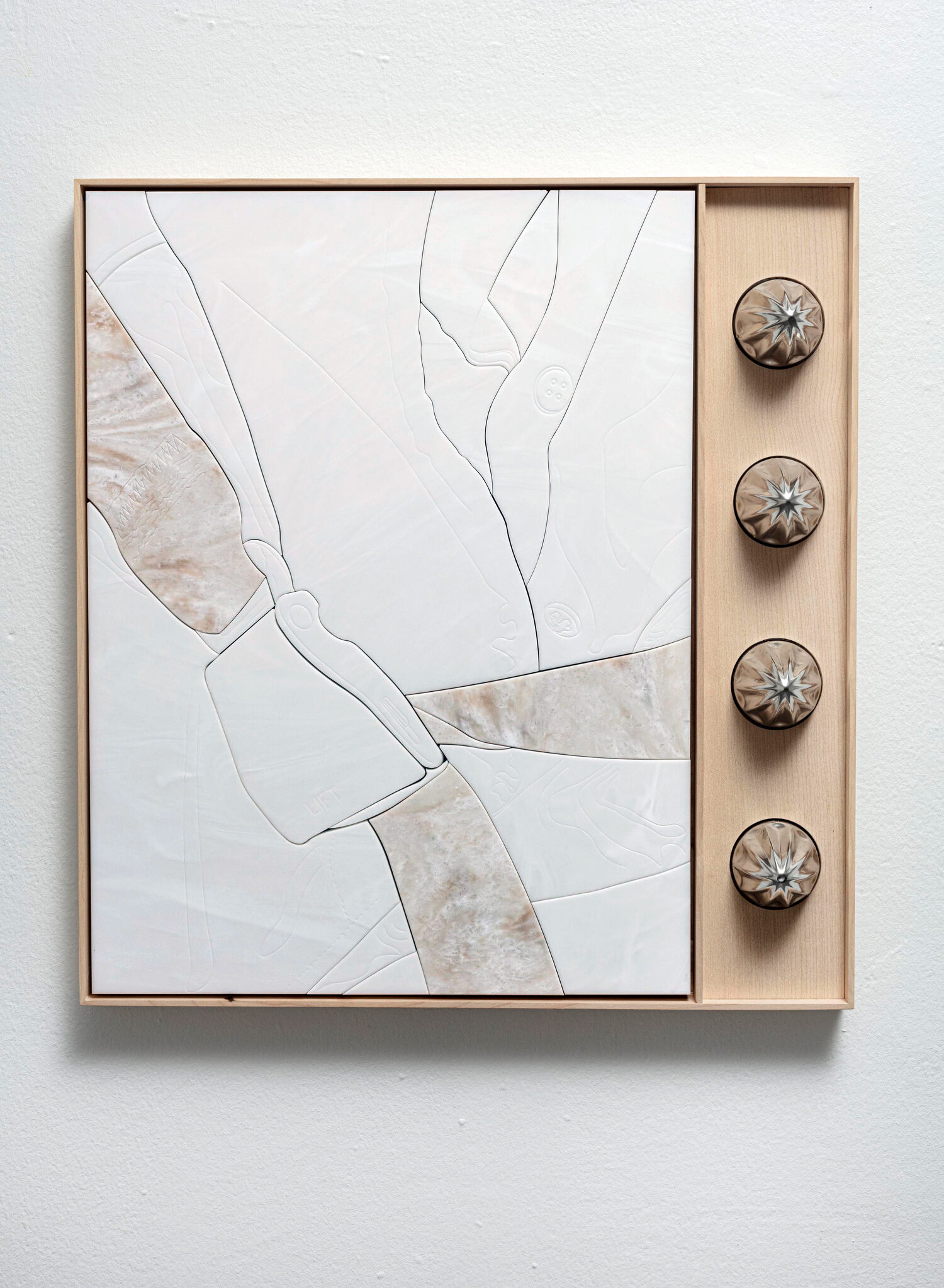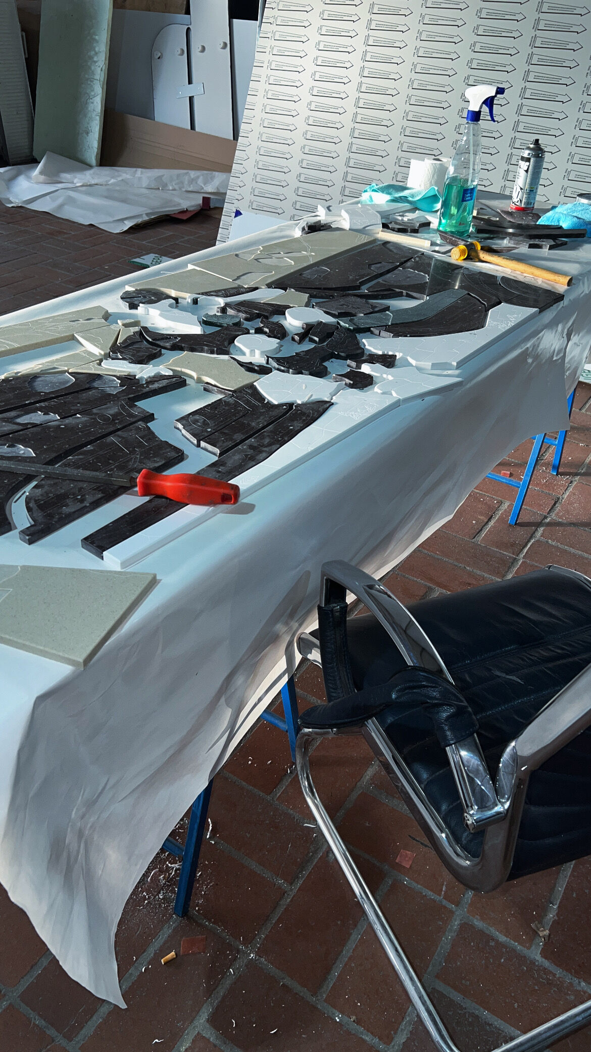 I’m also continuing my work with marquetry in natural acrylic stone, using different colours of the material together with wood inlays to expand the crafted and three-dimensional side of the pieces. The CNC-cut echos the industrial present, yet the finished work feels surprisingly analog, almost hand-carved. It’s a mix of digital precision and a physical presence that quietly pushes back against it.