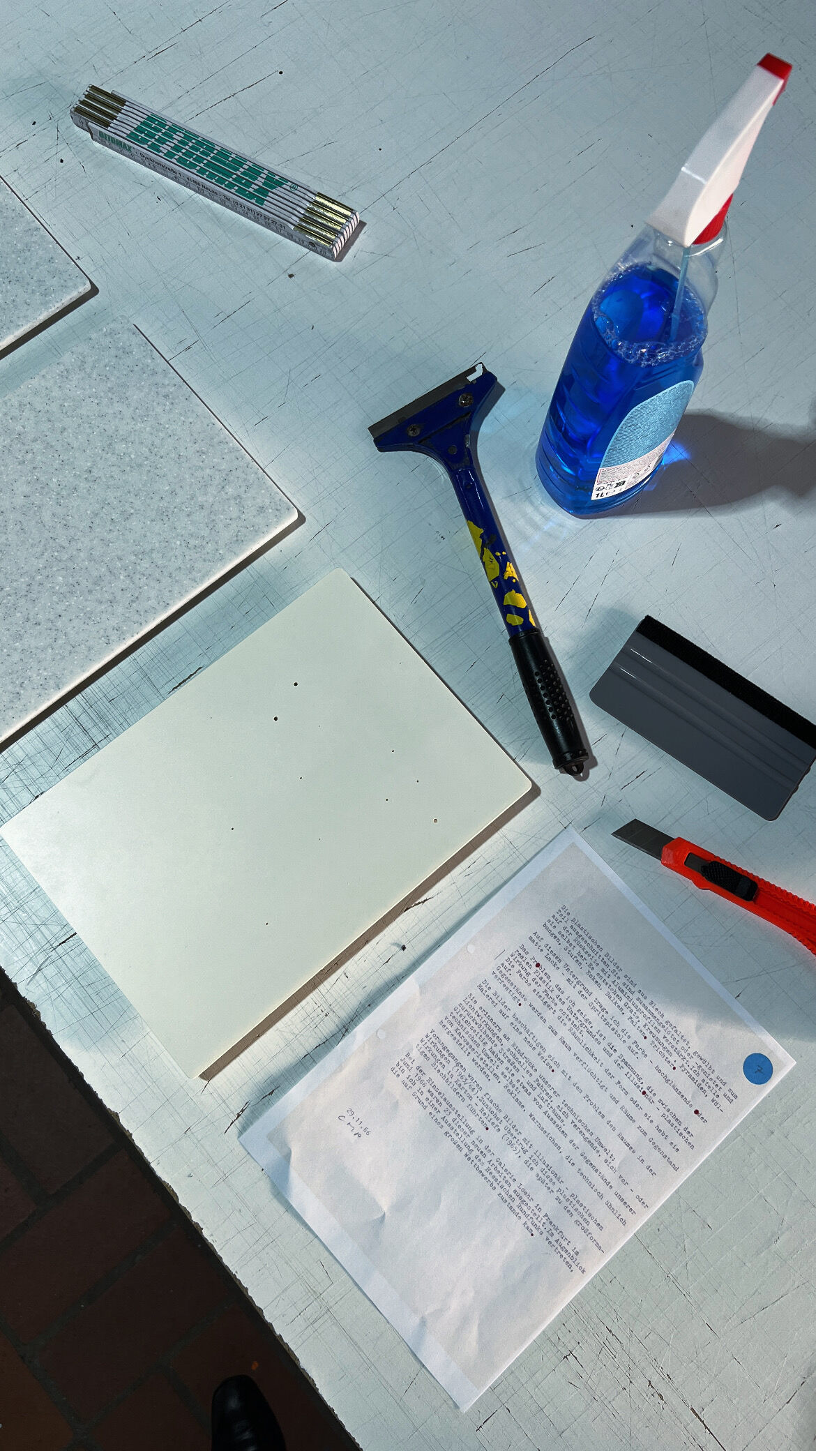 I’m exploring how tenderness can steady us when the boundaries between the digital and the analog blur, offering a brief sense of orientation in a tempo that rarely matches our own. I see tenderness as a form of resistance, a way of slowing down, paying attention, and staying present in moments that usually dissolve into noise. It is a method as much as a mood. The mirror edition presented here is the first small teaser of the upcoming project. It gently disrupts our perception, while the engraved handwriting evokes a soft nostalgia that soothes, anchors, and quietly opens the door to tenderness.