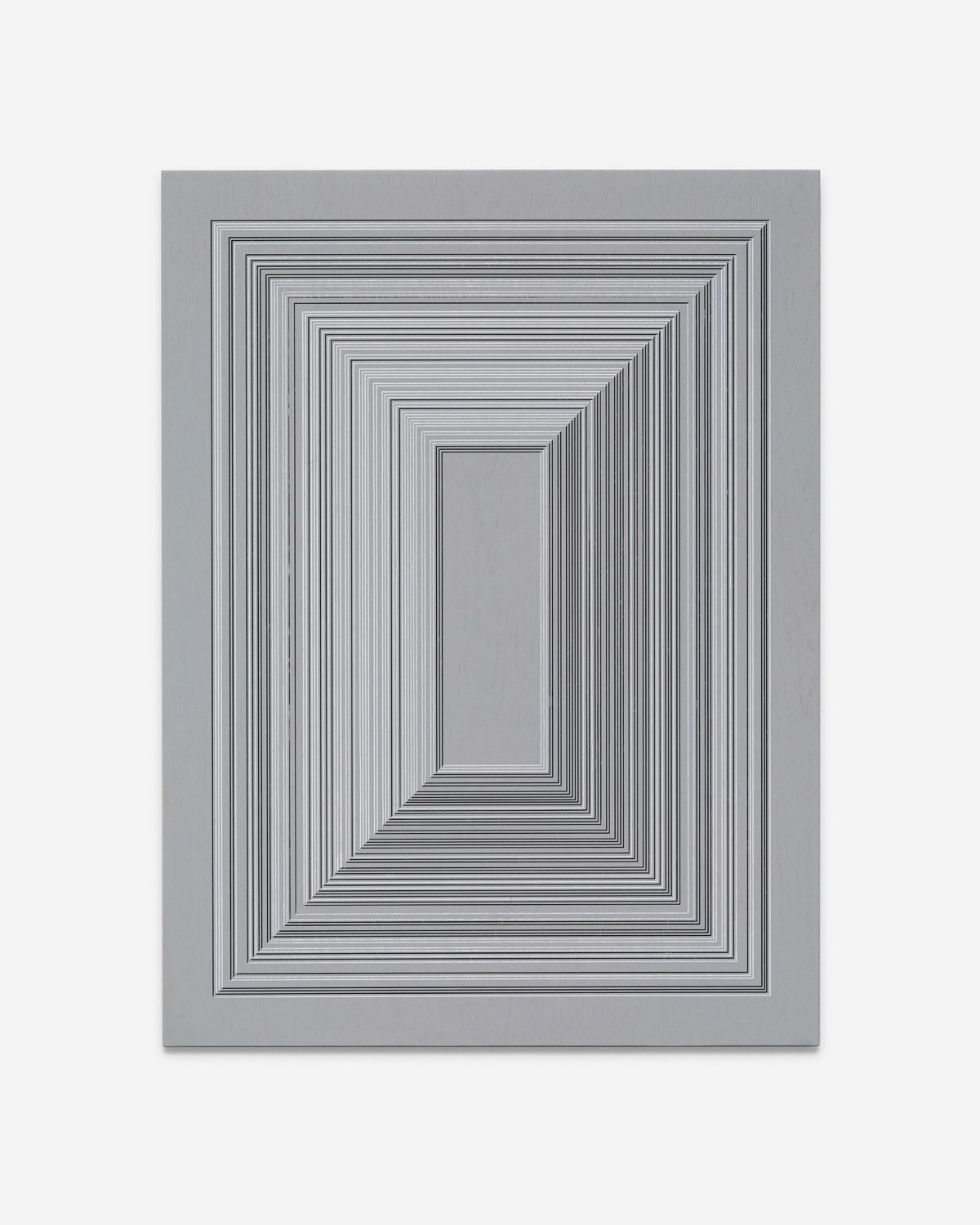 In dialogue with Wanderer, Ornaments present a new material iteration of Leegte’s long-standing investigation into digital ornamentation. This series consists of paint- on-wood-panel plotter works, each based on generative algorithms that produce complex bevelling structures, referencing both the aesthetics of GUI design and the architectural ornament.