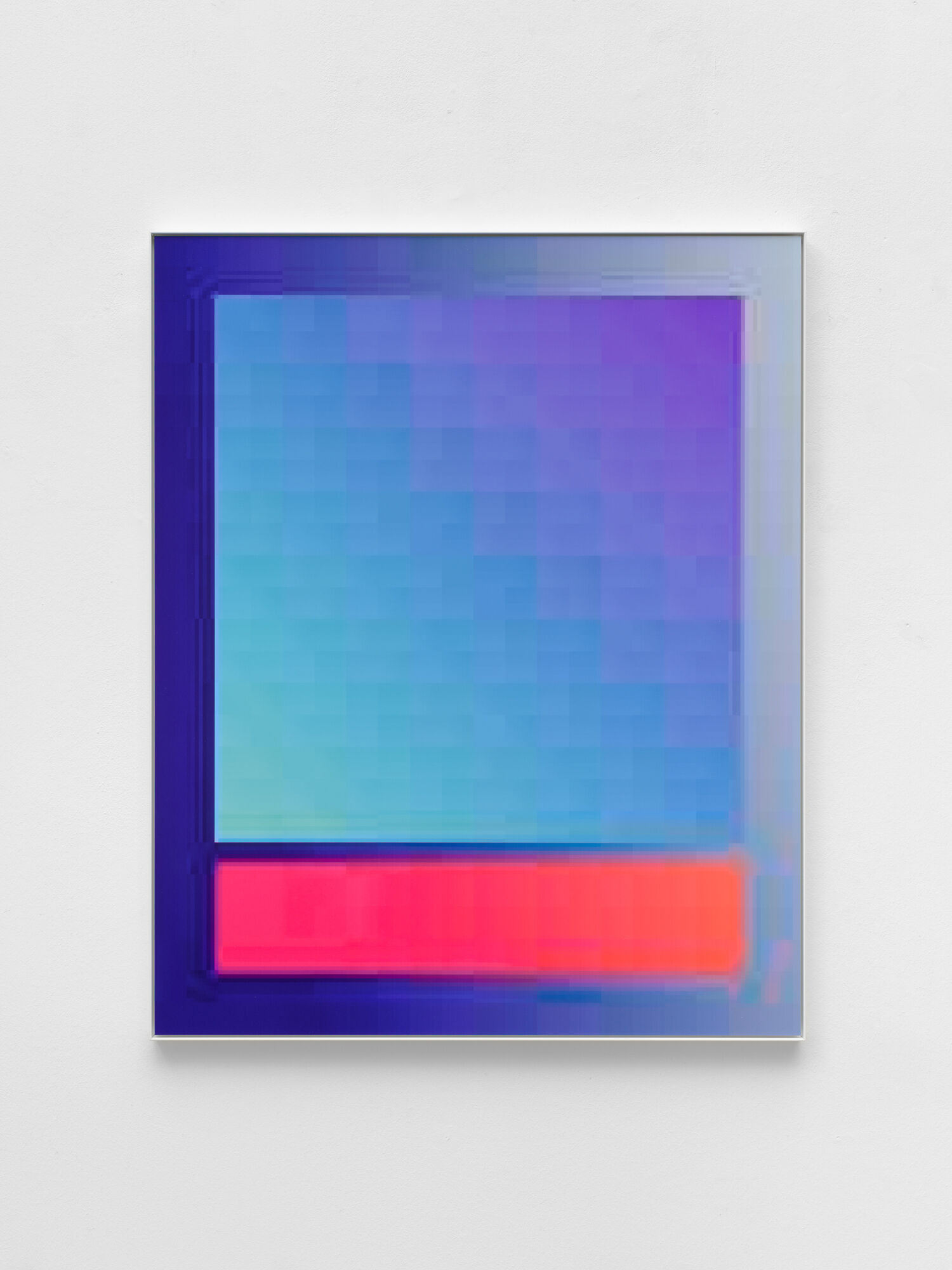The works from the JPEG series try to create an image programmatically fully expressing that signature compression. An image that is made from barely nothing, yet fully present in its blazing appearance. A work deeply material, expressing itself through the language of code and codec transferred to a plate of aluminum. This is not a JPEG depicting an image. The JPEG is the image itself.